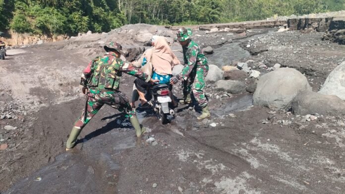 “Kami hadir untuk memastikan warga tetap aman. Sungai yang dipenuhi material lahar dan lumpur membuat mereka kesulitan melintas. TNI wajib berada di depan untuk membantu, karena ini bagian dari tugas kami sebagai pelindung dan pengayom rakyat,” ujarnya.