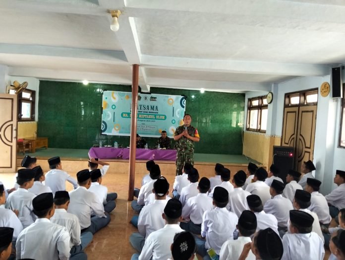 Lumajang, Dalam rangka menanamkan nilai-nilai nasionalisme dan cinta tanah air, Babinsa Banyuputih Kidul dari Koramil 0821/12 Jatiroto, Serda Yudik, melaksanakan kegiatan Wawasan Kebangsaan (Wasbang) kepada ratusan santri Madrasah Aliyah (MA) Pondok Pesantren Miftahul Ulum Dusun Krajan 2, RT 004 RW 005, Desa Banyuputih Kidul, Kecamatan Jatiroto, Kabupaten Lumajang, Jawa Timur, pada Senin (8/7/2024).