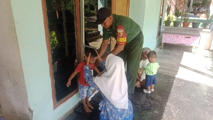 Lumajang, Sebagai bentuk dukungan terhadap kesehatan masyarakat, Babinsa Duren Koramil 0821-05/Klakah, Koptu Oli Julian, melaksanakan pendampingan monitoring kegiatan pelayanan Posyandu Mawar Merah di Dusun Darungan RT 003 RW 002, Desa Duren, Kecamatan Klakah, Kabupaten Lumajang, Jawa Timur, pada Kamis (17/10/2024).