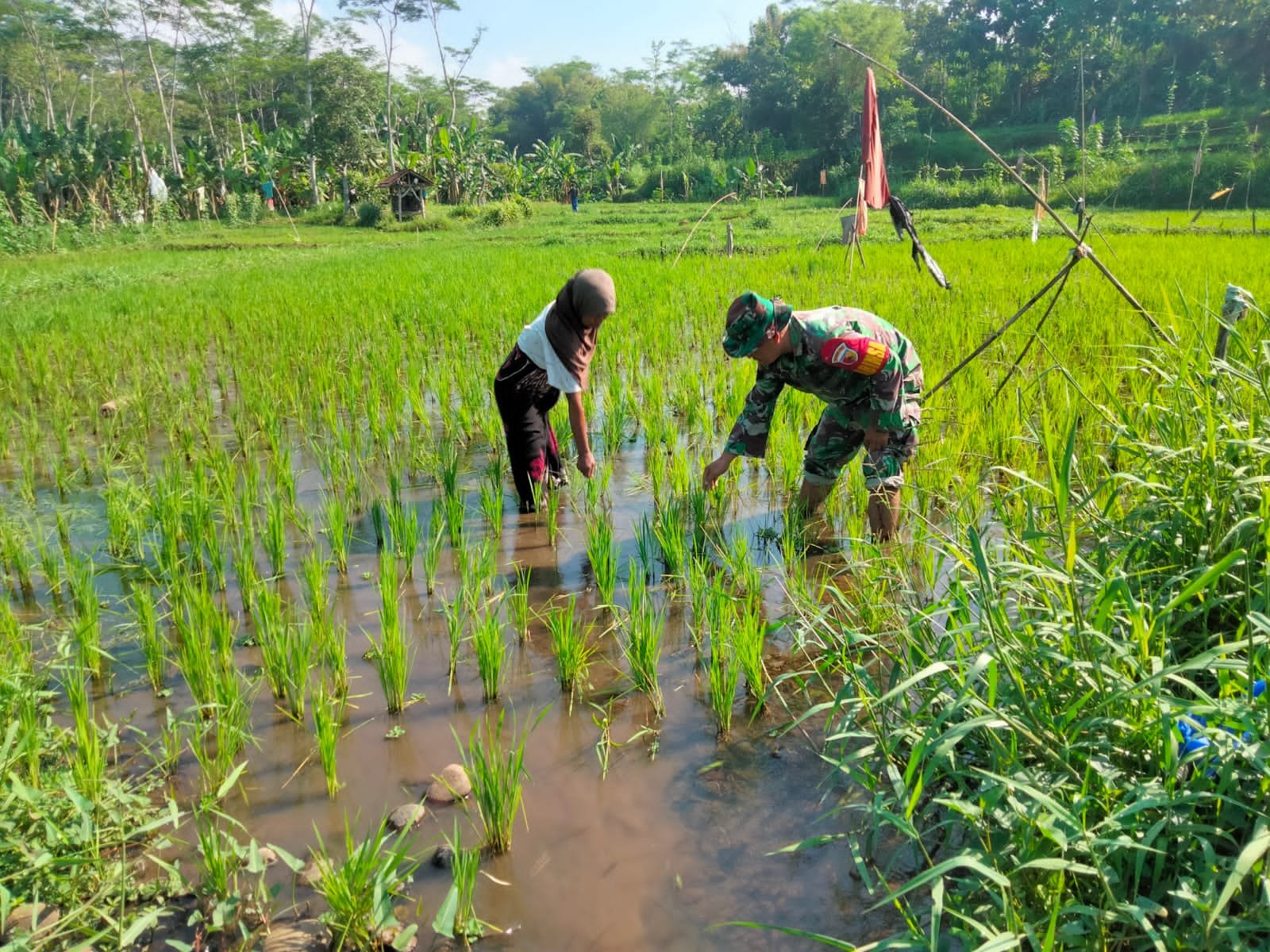 Lumajang, Dalam rangka mendukung program ketahanan pangan (Hanpangan), Bintara Pembina Desa (Babinsa) Jatisari dari Posramil 0821/05 Kedungjajang, Serka Agus Wiranto, melaksanakan kegiatan pendampingan pertanian. Kegiatan ini difokuskan pada perawatan tanaman padi agar tumbuh dengan optimal serta meminimalisir serangan hama dan gulma.