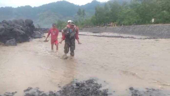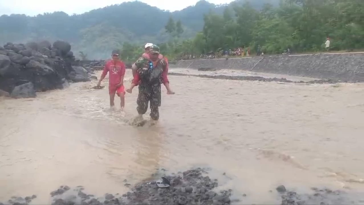 Dalam upaya memberikan bantuan dan dukungan kepada masyarakat yang terdampak, Babinsa Jugosari Koramil 0821/09 Candipuro Serka Novi Wahyu Santoso, terlibat langsung dalam upaya solidaritas kemanusiaan dengan memberikan kemudahan anak sekolah dalam menyebrang sungai tersebut..