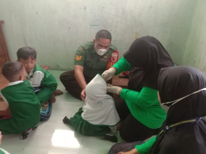 Lumajang, Babinsa Kalidilem Koramil 0821/07 Randuagung Serka Abdul Munib, melaksanakan pendampingan kegiatan Sub Pin Polio kepada siswa Ra Al Makmur Dusun Karang Anyar RT 040 RW 011 Desa Kalidilem Kecamatan Randuagung Kabupaten Lumajang, Jawa Timur, Selasa (30/1/2024).