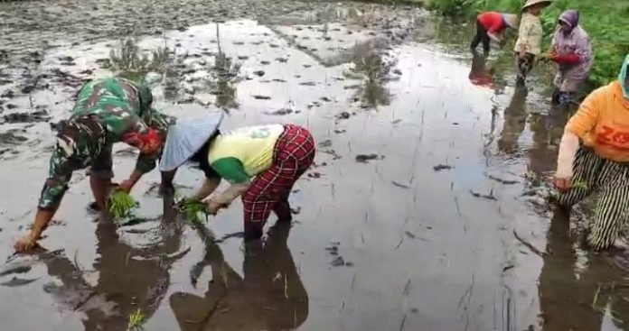 Lumajang, Dalam upaya meningkatkan kualitas pertanian dan mendukung ketahanan pangan di wilayah, Babinsa Desa Nguter Koramil 0821/08 Pasirian, Sertu Eko Prasetyo, melaksanakan kegiatan pendampingan penanaman padi di Dusun Basuki, Desa Nguter, Kecamatan Pasirian, Kabupaten Lumajang, Jawa Timur, Sabtu (15/6/2024).