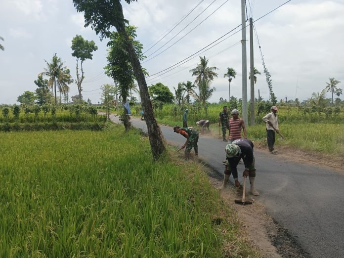 Lumajang, Sebagai upaya mewujudkan lingkungan berseri, Babinsa Sentul Koramil 0821/19 Koptu Ibnu Khotob, bersama warga melaksanakan kegiatan kerja bakti pembersihan kanan kiri Jalan di Dusun Sumber Desa Sentul Kecamatan Sumbersuko Kabupaten Lumajang, Jawa Timur, Senin (5/2/2024).