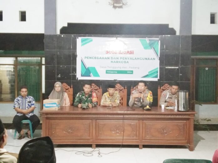 Lumajang, Babinsa Tanggung Koramil 0821-20/Padang, Serda Mohammad Sholeh Ridwan, bersama unsur terkait turut hadir dalam kegiatan sosialisasi bahaya narkoba yang digelar Polsek Padang di Balai Desa Tanggung, Kecamatan Padang, Kabupaten Lumajang, Jawa Timur, pada Jumat (5/9/2025).