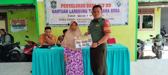 Lumajang, Jawa Timur – Dalam rangka mendukung penyaluran bantuan pemerintah agar berjalan lancar, transparan, dan tepat sasaran, Babinsa Umbul Koramil 0821-05/Kedungjajang, Sertu Hadi Susanto, turut mendampingi kegiatan Penyaluran Bantuan Langsung Tunai Dana Desa (BLT DD) Tahun Anggaran 2025 di Kantor Desa Umbul, Kecamatan Kedungjajang, Kabupaten Lumajang, pada Senin (27/10/2025).
