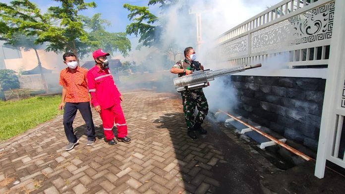 Lumajang, Sebagai upaya dan bentuk kewaspadaan terhadap berkembangnya penyakit demam berdarah dengue (DBD), Babinsa Tekung Koramil 0821/15 Tekung Serka Hariyanto, melaksanakan pendampingan kegiatan Fogging/pengasapan yang dilakukan oleh dinas kesehatan melalui Puskesmas Tekung bertempat di pemukiman Dusun Magersari RT 001 RW 001 Desa Tekung Kecamatan Tekung Kabupaten Lumajang, Jawa Timur, Selasa (5/2/2024).