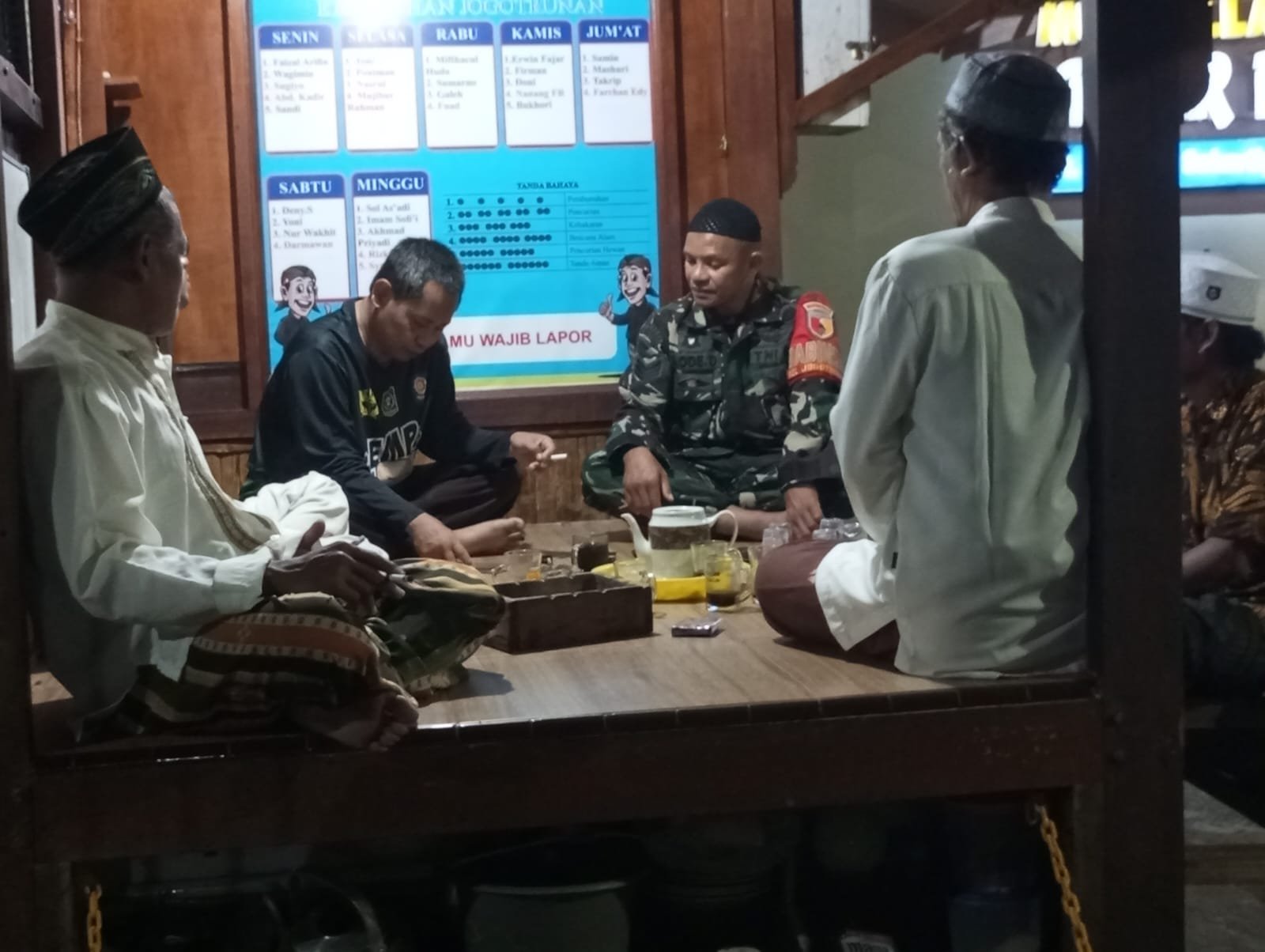 Lumajang, Untuk mewujudkan keamanan lingkungan pada bulan puasa, Babinsa Jogotrunan Koramil 0821/01 Lumajang Serka Darsono Laode, melaksanakan patroli wilayah bertajuk Sambang Pos Kamling bersama warga RT 001 RW 002 Kelurahan Jogotrunan Kecamatan Lumajang, Jawa Timur, Senin (18/3/2024) malam.