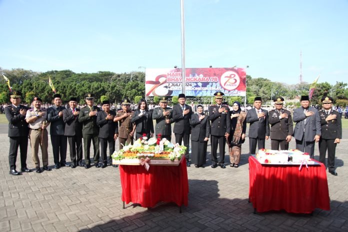Upacara yang digelar secara langsung di jajaran polri diseluruh Indonesia untuk memperingati HUT Bhayangkara ke-78 tahun 2024 dengan tema “Presisi Mendukung Percepatan Transformasi Ekonomi yang Inklusif dan Berkelanjutan Menuju Indonesia Emas 2045”, Bertindak selaku Inspektur Upacara Kapolres Lumajang AKBP Mohmmad Zainur Rofik.