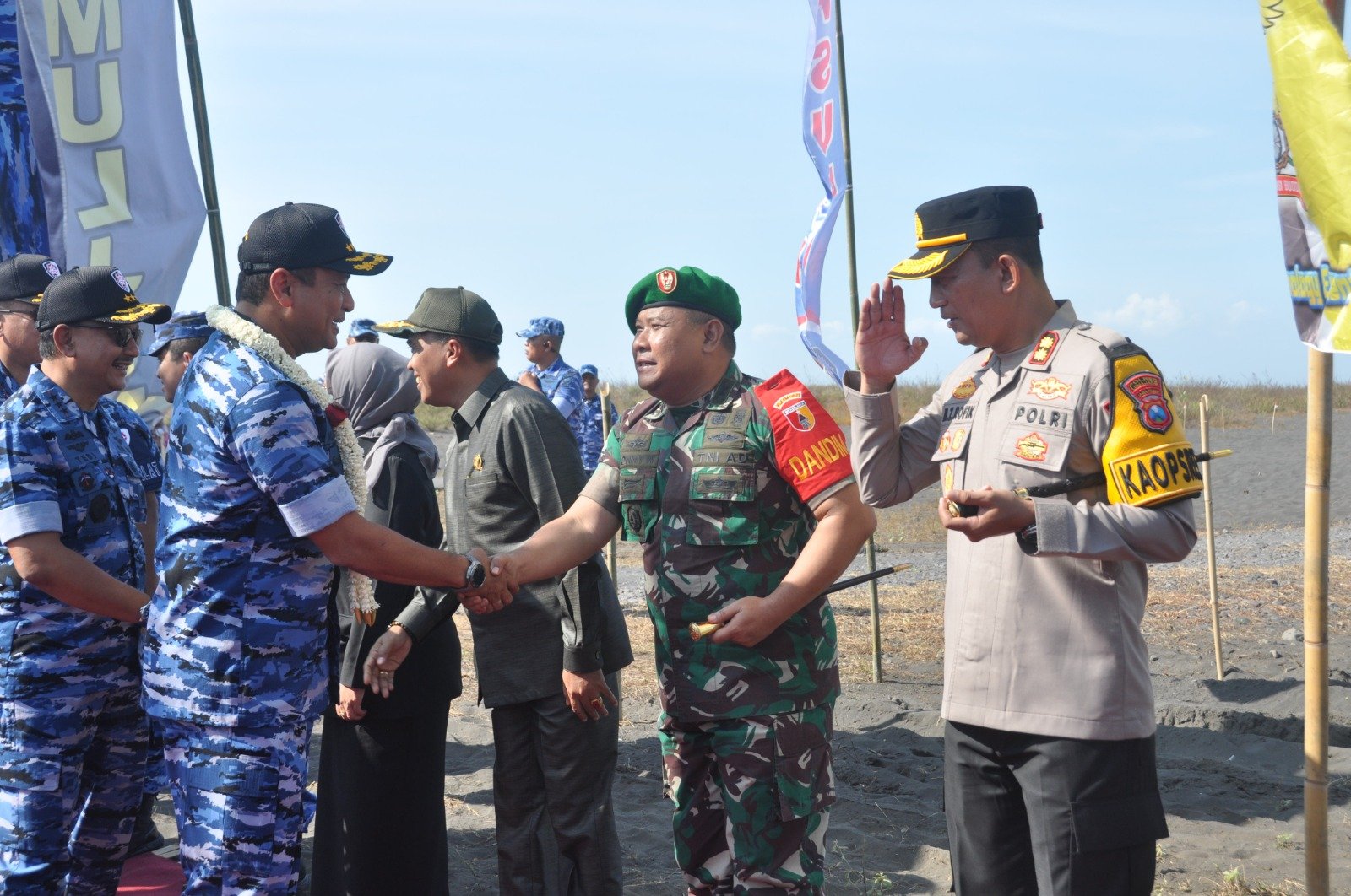 Lumajang, Dandim 0821/Lumajang Letkol Inf Ronny Wijaya Koesuma bersama jajaran Forum Koordinasi Pimpinan Daerah (Forkopimda) menyambut kedatangan Kepala Staf Angkatan Udara (Kasau) Marsekal TNI Mohamad Tonny Harjono beserta rombongan dalam rangka meninjau latihan Sikatan Daya 2024 yang berlangsung di Air Weapons Range (AWR) Pandanwangi, Kecamatan Tempeh, Kabupaten Lumajang, Selasa (9/7/2024).
