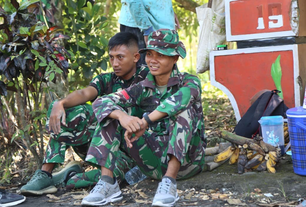 Salah satu anggota Satgas, Pratu Alhalim, terlihat duduk santai bersama rekannya di bawah pepohonan sambil berbagi tawa. Meski tubuh mereka lelah setelah seharian bekerja keras membangun drainase, semangat dan kebersamaan tetap terpancar jelas di wajah keduanya.