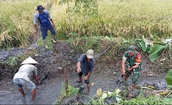Dukung Ketahanan Pangan, Babinsa Blukon Turun Tangan Bersihkan Irigasi Tersier