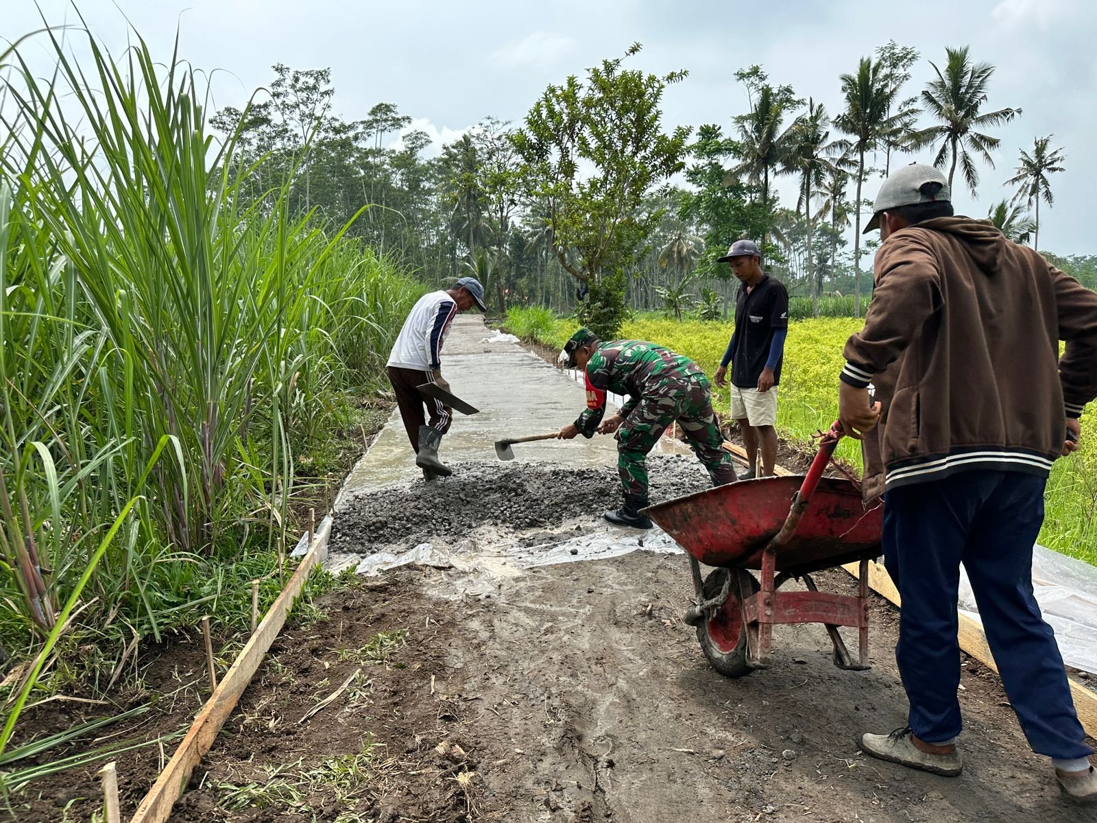 Lumajang, Sebagai upaya mengawal program pemerintah desa, Babinsa Ranupakis Koramil 0821/05 Klakah Serda Yuliyanto, melaksanakan karya bakti pembangunan jalan rabat beton di Dusun Krajan RT 002 RW 001 Desa Ranupakis Kecamatan Klakah Kabupaten Lumajang, Jawa Timur, Kamis (29/2/2024)