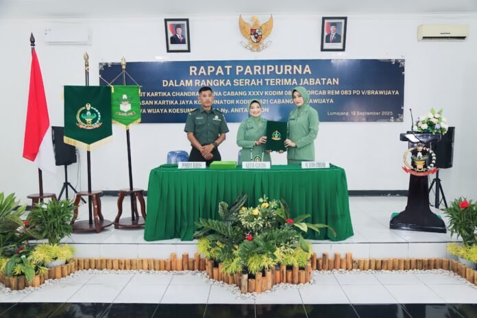 Lumajang – Persit Kartika Chandra Kirana (KCK) Cabang XXXV Dim 0821 Lumajang, melaksanakan acara serah terima jabatan Ketua Persit dari Ny. Nouva Wijaya Koesuma kepada Ketua baru, Ny. Anita Anton. Acara berlangsung di Aula Raden Wijaya Makodim 0821 Lumajang, Jumat (12/9/2025).