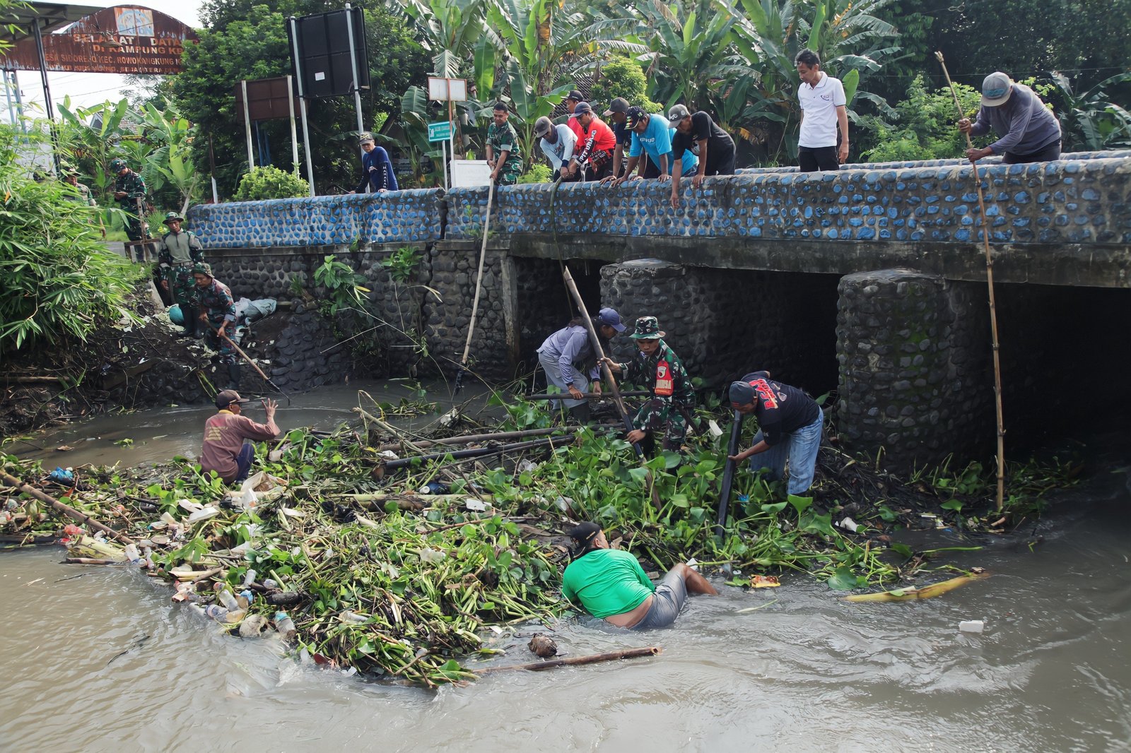 Sedikitnya 100 orang hadir dalam karya bakti tersebut, terdiri dari personel TNI, pemerintah desa, komunitas peduli lingkungan, serta masyarakat setempat yang secara sukarela ikut mengambil bagian membersihkan kawasan bantaran sungai.