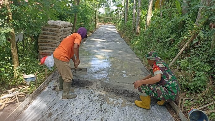 Lumajang, Sebagai komitmennya dalam mendukung pembangunan infrastruktur desa, Babinsa Tunjung Koramil 0821/04 Gucialit, Serka Masruri, melaksanakan pendampingan dalam karya bakti pengecoran jalan, sepanjang 100 meter dengan lebar 1,25 meter di Dusun Sekar Mulyo RT 003 RW 003, Desa Tunjung Kecamatan Gucialit Kabupaten Lumajang Jawa Timur, pada Minggu (12/5/2024).