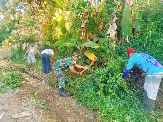 Lumajang, Mengedepankan semangat kebersamaan dan kepedulian terhadap lingkungan, Babinsa Mojo Koramil 0821-20/Padang, Sertu Ahmad Supenil, memimpin jalannya kerja bakti pembersihan saluran irigasi di sisi Jalan Dusun Kebonan RT 026 RW 003, Desa Mojo, Kecamatan Padang, Kabupaten Lumajang, Jawa Timur, pada Kamis (27/11/2025).