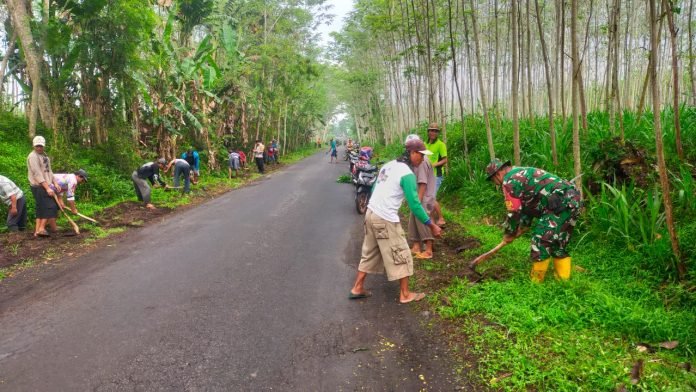 Lumajang, Bangun Kebersamaan, Babinsa Bades Koramil 0821/08 Pasirian Serda Saiful Hak, bersama warga, melaksanakan karya bakti pembersihan kanan kiri jalan Dusun Purut RT 001 RW 005 Desa Bades Kecamatan Pasirian Kabupaten Lumajang, Jawa Timur, Selasa (30/1/2024).