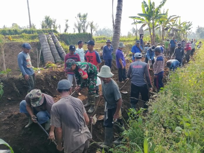 Lumajang, Babinsa Pasrujambe Koramil 0821-17/Pasrujambe, Serda Amil Fahrudin, bersama masyarakat Dusun Krajan II Desa Pasrujambe, menggelar karya bakti TNI untuk pelebaran jalan menuju Makam.