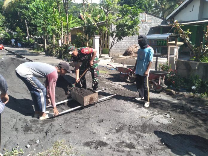 Lumajang, Babinsa Tegalrejo Koramil 0821/18 Tempursari Koptu Hari Irawan, bersama warga Desa Tegalrejo, Kecamatan Tempursari, Kabupaten Lumajang, Jawa Timur, melaksanakan kerja bakti dalam pengecoran jalan sepanjang 500 meter di Jalan Dusun Tegalbanteng pada Minggu (9/6/2024).