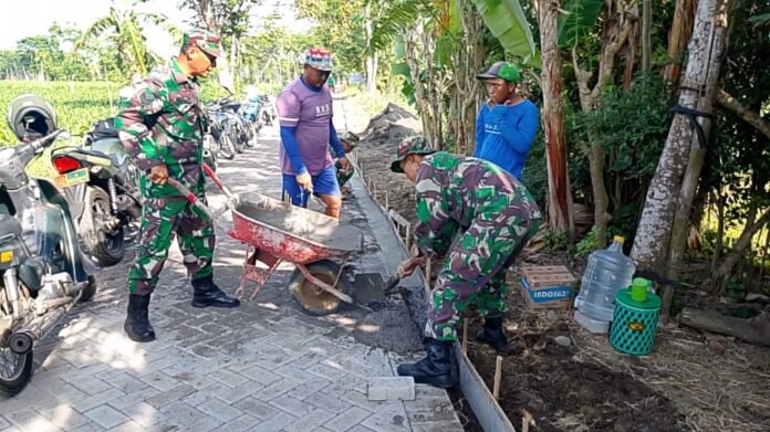 Lumajang, Babinsa Krai Koramil 0821-11/Yosowilangun, Serma Sugeng Agus Wiyono, turut serta melaksanakan pendampingan kegiatan pemasangan paving blok jalan pertanian milik Kelompok Tani (Poktan) Suko Maju di Dusun Kebonan RT 004 RW 006 Desa Krai, Kecamatan Yosowilangun, Kabupaten Lumajang, Jawa Timur, pada Kamis (3/10/2025).