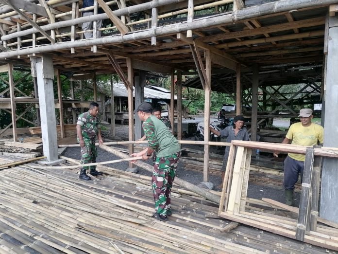Lumajang, Dalam rangka meningkatkan ekonomi warga binaan, Personel TNI Koramil 0821/17 Pasrujambe, bersama warga membantu membuat warung Pak Trubus, di Dusun Tulungrejo RT 003 RW 007 Desa Pasrujambe Kecamatan Pasrujambe Kabupaten Lumajang, Jawa Timur, Sabtu (3/2/2024).