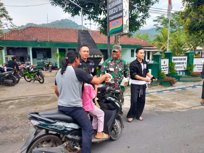 Lumajang, Dalam semangat kebersamaan dan kepedulian terhadap sesama, Koramil 0821/18 Bati Tuud Peltu Dwi Hasim As'ari bersama Keluarga besar PSHT Ranting Tempursari turut serta dalam kegiatan bagi takjil kepada masyarakat dan warga pengguna jalan. Kegiatan itu dilaksanakan di depan Makoramil 0821/18 Tempursari Kabupaten Lumajang, Jawa Timur, Minggu (7/4/2024).