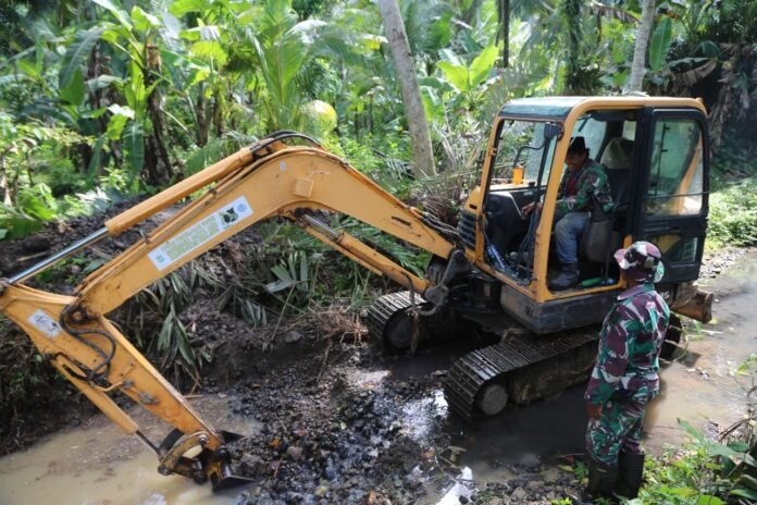 Terlihat Kopka Paito, salah satu personel Satgas TMMD, dengan penuh ketelitian mengoperasikan alat berat untuk mengeruk dan memperdalam aliran sungai. Langkah ini bertujuan memperlancar aliran air serta mencegah terjadinya luapan yang kerap mengganggu aktivitas masyarakat di musim hujan.