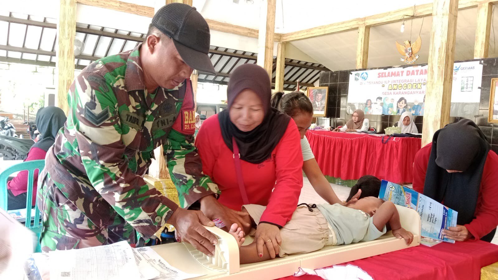 Lumajang, Komitmen TNI AD dalam mendukung peningkatan kualitas kesehatan masyarakat kembali ditunjukkan melalui peran aktif Babinsa di wilayah binaan. Babinsa Karanganyar Koramil 0821-11/Yosowilangun, Sertu Taufiq Abdul Lukito, melaksanakan pendampingan sekaligus monitoring kegiatan Posyandu yang digelar di Kantor Desa Karanganyar, Kecamatan Yosowilangun, Kabupaten Lumajang, Jawa Timur, pada Minggu (14/12/2025).