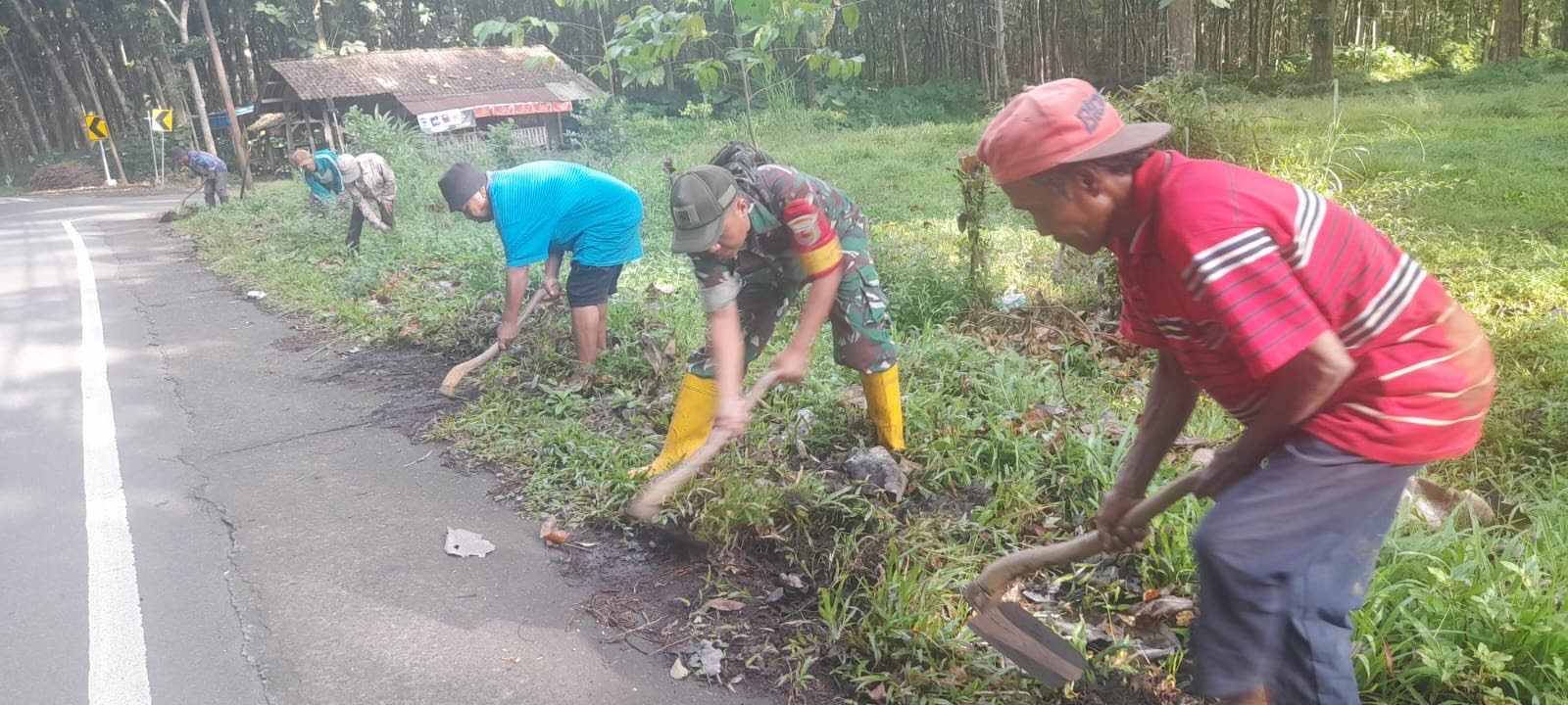 Lumajang, Wujud nyata sinergi lintas sektor kembali ditunjukkan di wilayah Kecamatan Senduro. Babinsa Sarikemuning Koramil 0821-03/Senduro, Serda Muhammad Triwijayanto, bersama petugas Perhutani BPKH Senduro di bantu warga melaksanakan kerja bakti pembersihan jalan lintas provinsi yang melintasi kawasan hutan jati di Dusun Krajan, Desa Sarikemuning, Kabupaten Lumajang, Jawa Timur, Selasa (30/12/2025).