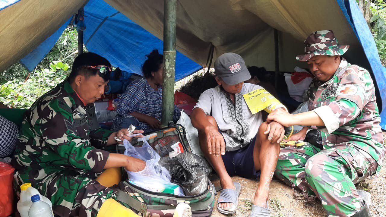 “Kami memastikan warga mendapatkan penanganan awal dengan cepat. Banyak di antara mereka yang mengalami batuk, luka lecet, dan kelelahan,” ungkap Peltu Iswahyudi saat menangani salah satu warga lanjut usia.