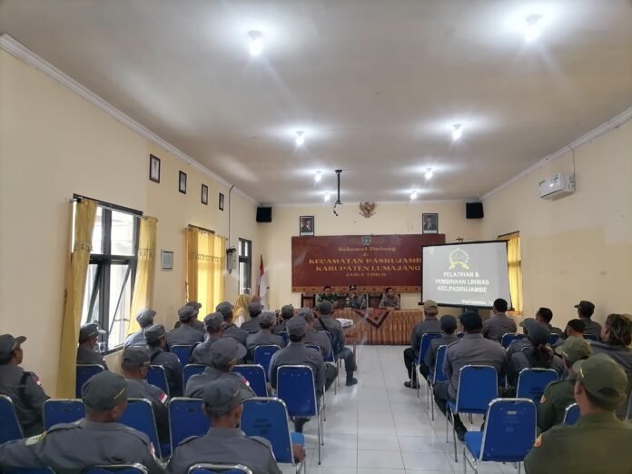 Lumajang, Upaya mempercepat penyelenggaraan ketentraman dan ketertiban umum di wilayah Kecamatan Pasrujambe semakin diperkuat. Personel Koramil 0821-17/Pasrujambe, Serma Yunus Arianto dan Sertu Ade Dian Febrianto, memberikan materi pelatihan dan pembinaan kepada 48 anggota Linmas se-Kecamatan Pasrujambe dalam kegiatan yang digelar di Aula Kecamatan Pasrujambe, Kabupaten Lumajang, Jawa Timur. Pada Jumat (14/11/2025).