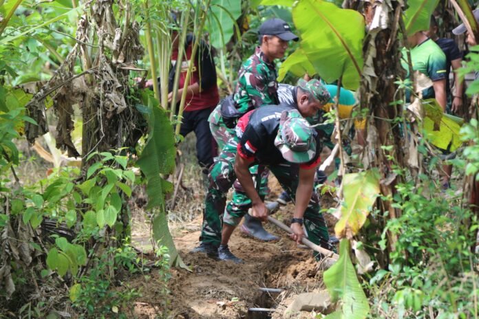 Melalui kerja sama yang solid, prajurit TNI bersama warga setempat bahu-membahu menggali jalur pipanisasi untuk memperlancar aliran air menuju kawasan pemukiman. Upaya tersebut dilakukan secara manual menggunakan alat sederhana, namun penuh semangat gotong royong dan rasa tanggung jawab terhadap kepentingan bersama.