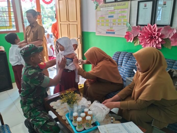 Lumajang, Upaya mendukung program kesehatan anak yang digagas oleh pemerintah.Babinsa Grobogan Posramil 0821-05/Kedungjajang, Serka Slamet, turut serta dalam pendampingan program Bulan Imunisasi Anak Sekolah (BIAS) yang dilaksanakan di SDN Grobogan 03, Kecamatan Kedungjajang Kabupaten Lumajang, Jawa Timur, pada Jumat (23/8/2024).