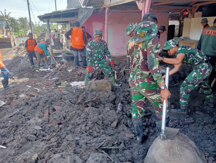 Pulihkan Permukiman, Personel TNI dan Relawan Evakuasi Material Vulkanik di Gumukmas.