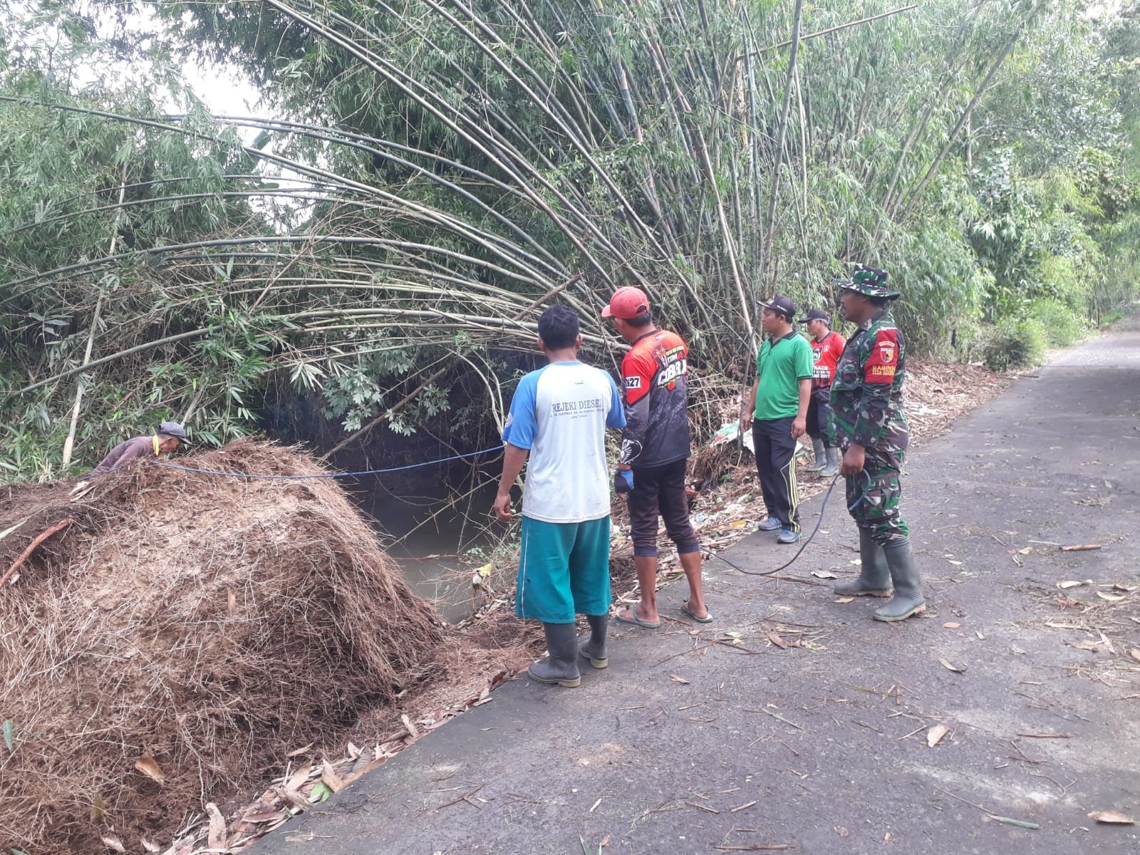 Lumajang, Bersama pemerintah desa dibantu oleh SKD dan masyarakat setempat, Babinsa Sidorejo bergotong royong untuk menangani Bambu yang tumbang di Sungai Menjangan Mati Dusun Penggung Kidul RT 021 RW 010 Desa Sidorejo Kecamatan Rowokangkung Kabupaten Lumajang, Jawa Timur, Kamis (4/1/2024).