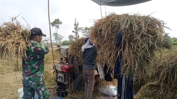 Lumajang, Dalam upaya mendukung ketahanan pangan nasional, Babinsa Desa Jatimulyo, Koramil 0821/13 Kunir, Serda Ary Agus Wulandono, melaksanakan kegiatan pendampingan ketahanan pangan nasional dengan memantau panen padi seluas 0,7 hektar milik Satab Jainuri, anggota kelompok tani Tani Mulyo di Dusun Sumberwongso Desa Jatimulyo Kecamatan Kunir Kabupaten Tempeh, Jawa Timur, Jumat (7/6/2024).