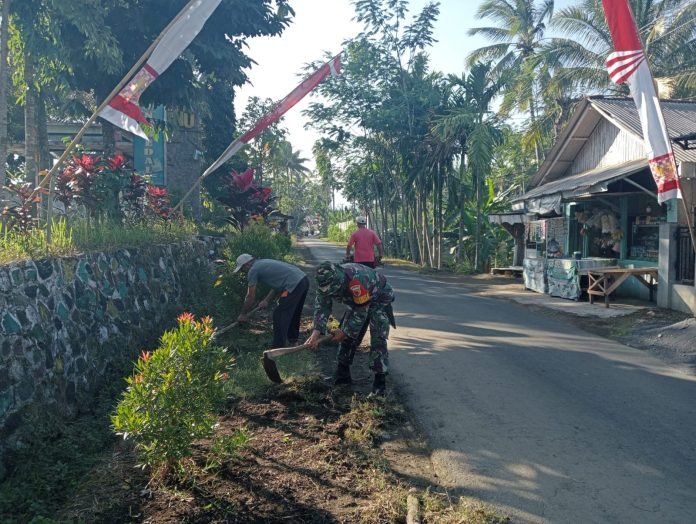 Lumajang, Dalam Rangkaian menyambut Hari Ulang Tahun (HUT) Kemerdekaan Republik Indonesia yang ke-79, Babinsa Koramil 0521/06 Ranuyoso Koptu Muhammad Sidik bersama warga, melaksanakan kegiatan karya bakti pembersihan jalan secara serentak, di sepanjang jalan Desa Ranubedali, Kecamatan Ranuyoso, Kabupaten Lumajang, Jawa Timur, Pada Senin (5/8/2024).