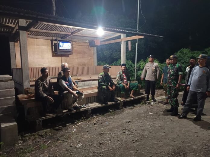 Lumajang, Untuk menjaga keamanan dan ketertiban lingkungan, Babinsa Sememu Koramil 0821-08/Pasirian, Serma Siyono, bersama Bhabinkamtibmas Desa Sememu, Aipda Heri Subagio, melaksanakan patroli dialogis bersama Satgas Keamanan Desa (SKD) dan warga di Poskamling Dusun Kedung Supit RT 006 RW 003, Desa Sememu, Kecamatan Pasirian, Kabupaten Lumajang, Jawa Timur, pada Selasa (19/8/2025) malam.