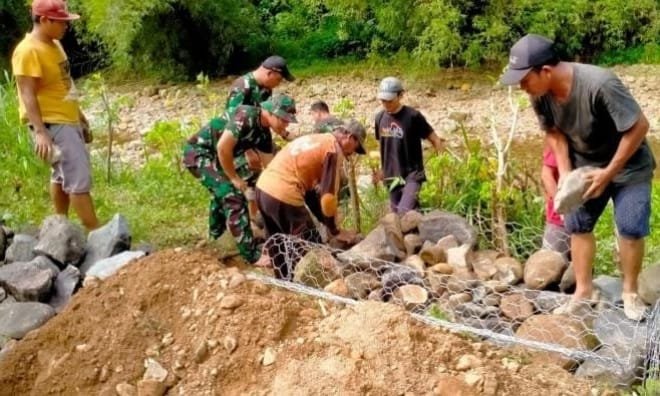 Pemandangan kebersamaan itu menjadi simbol nyata kemanunggalan TNI dan rakyat. Dari remaja hingga para sesepuh desa turun langsung ke lapangan. Mereka mengangkat batu kali, menyiapkan kawat bronjong, hingga menyusun batu satu per satu dengan penuh semangat di bawah terik matahari.