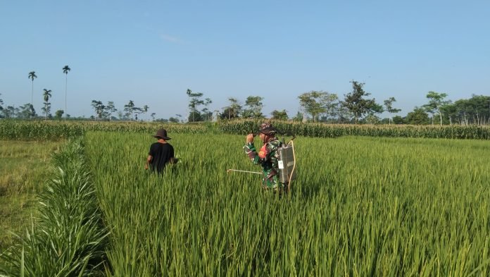 Lumajang, Sebagai upaya untuk meningkatkan produktivitas pertanian dan mengatasi tantangan yang dihadapi oleh petani, seorang Babinsa dari Tempeh Kidul Koramil 0821/10 Tempeh Serka Zainul Arifin, telah aktif melaksanakan pendampingan dalam penyemprotan hama padi di lahan sawah seluas 0,5 hektar. Lahan sawah tersebut merupakan milik Muhammad Saipul, seorang petani yang juga merupakan anggota kelompok tani “Suko Tani”, di Dusun Cikalan RT 006 RW 003, Desa Tempeh Kidul, Kecamatan Tempeh, Kabupaten Lumajang, Jawa Timur, Rabu (15/5/2024).