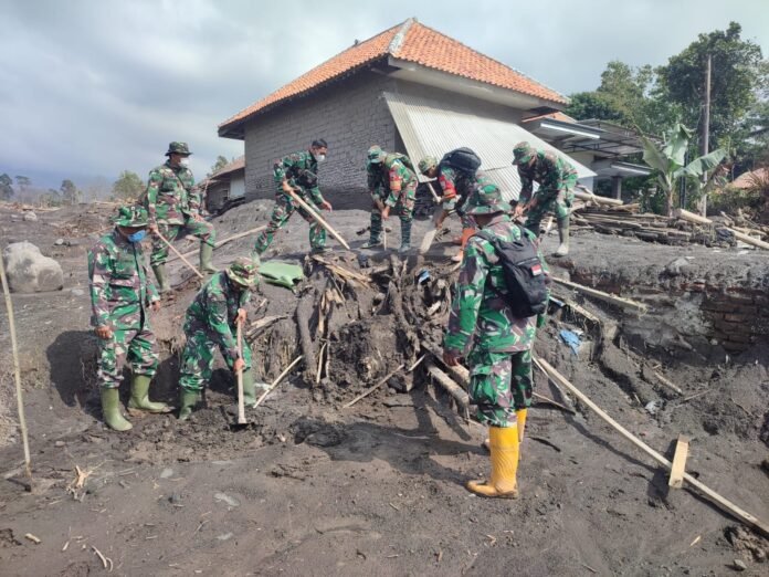 Lumajang – Batuud Koramil 0821/17 Pasrujambe Serma Jianto bersama personel lainnya melaksanakan kegiatan peninjauan dan pembersihan wilayah pasca erupsi Semeru di Desa Supiturang, Kecamatan Pronojiwo. Rabu(26/11/2025).