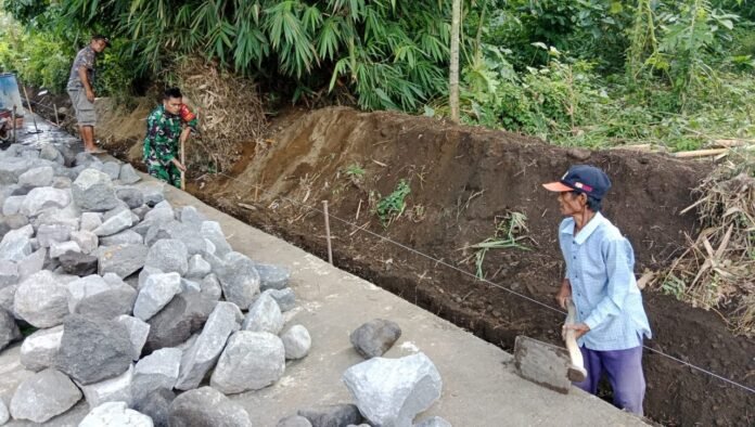 Lumajang — Wujud kepedulian TNI dalam mendukung pembangunan infrastruktur desa kembali terlihat saat Babinsa Tumpeng Koramil 0821-09/Candipuro, Sertu Antok Sujarwo, terjun langsung membantu warga melaksanakan kerja bakti perbaikan plengsengan sepanjang 850 meter di Dusun Tumpeng Krajan RT 002 RW 001, Desa Tumpeng, Kecamatan Candipuro, Kabupaten Lumajang, Jawa Timur, pada Selasa (2/12/2025).