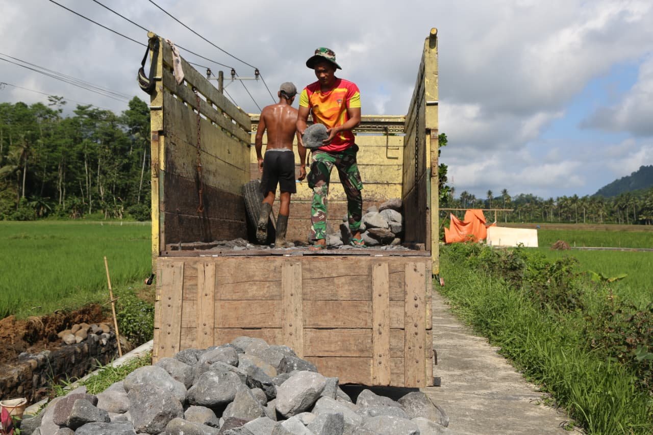 Terlihat para prajurit bersama warga bekerja sama menurunkan material dari atas truk secara bergantian. Kegiatan ini menjadi bagian penting dari proses pembangunan infrastruktur pedesaan yang tengah dikerjakan melalui program TMMD, termasuk pembuatan drainase dan normalisasi sungai.