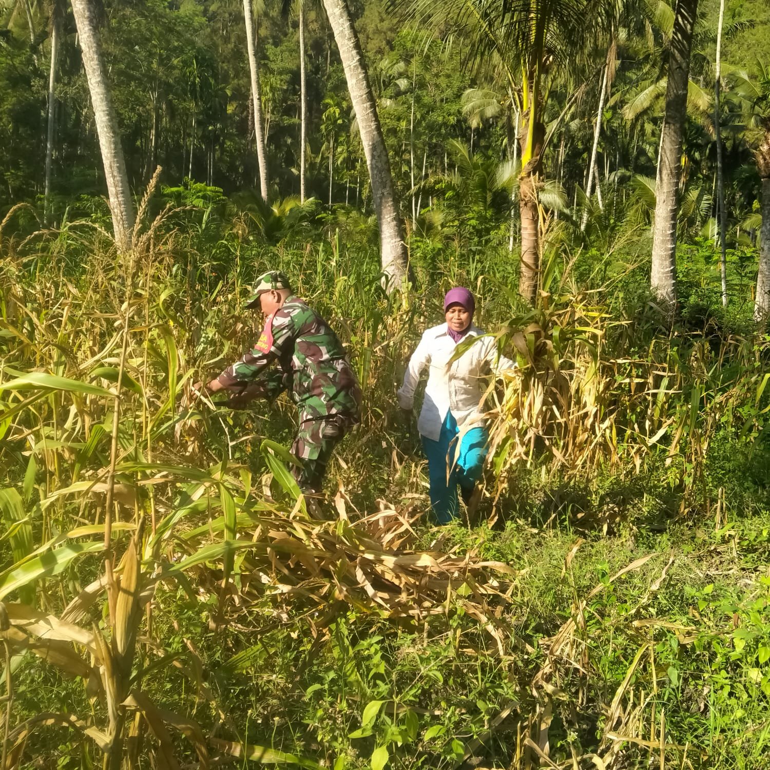 Lumajang, Sebagai bagian dari upaya memotivasi petani, Babinsa Jenggrong Koramil 0821-06/Ranuyoso, Koptu Suleman, melaksanakan pendampingan kepada warga tani dalam panen jagung, di lahan tadah hujan milik Suliadi, anggota kelompok tani Gemuling seluas 0,25 hektar di Dusun Gemuling, Desa Jenggrong, Kecamatan Ranuyoso, Kabupaten Lumajang, Jawa Timur, Senin (16/9/2024).