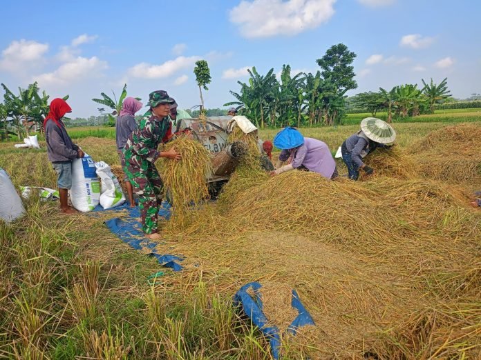 Upaya Dukung Hanpangan Lokal, Babinsa Kaliuling Melaksanakan Pendampingan Panen Padi Warga Tani