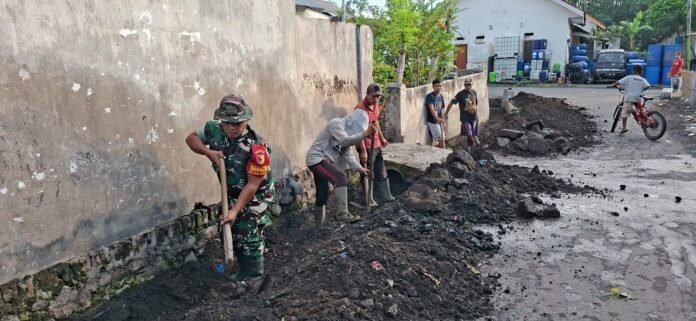 Lumajang, Dalam upaya menjaga kebersihan lingkungan dan kelancaran aliran air, Babinsa Pulo Koramil 0821-10/Tempeh, Serda Andrianto, bersama warga melaksanakan kegiatan kerja bakti normalisasi drainase dan pembersihan selokan di RT 004 RW 009 Dusun Wringincilik, Desa Pulo, Kecamatan Tempeh, Kabupaten Lumajang, Jawa Timur, pada Senin (13/10/2025).